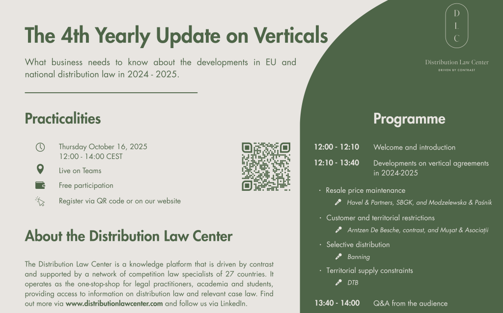 Join them for a 2-hour online lunch session, during which their experts will explain what you need to know about developments in EU and national distribution law in the past year.